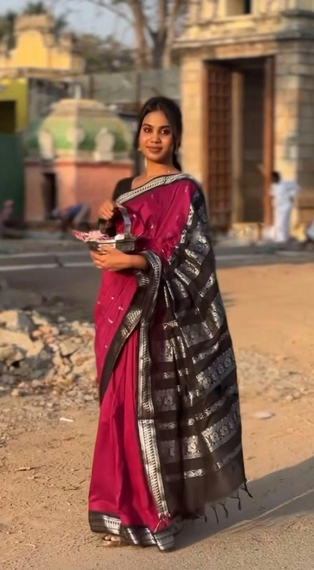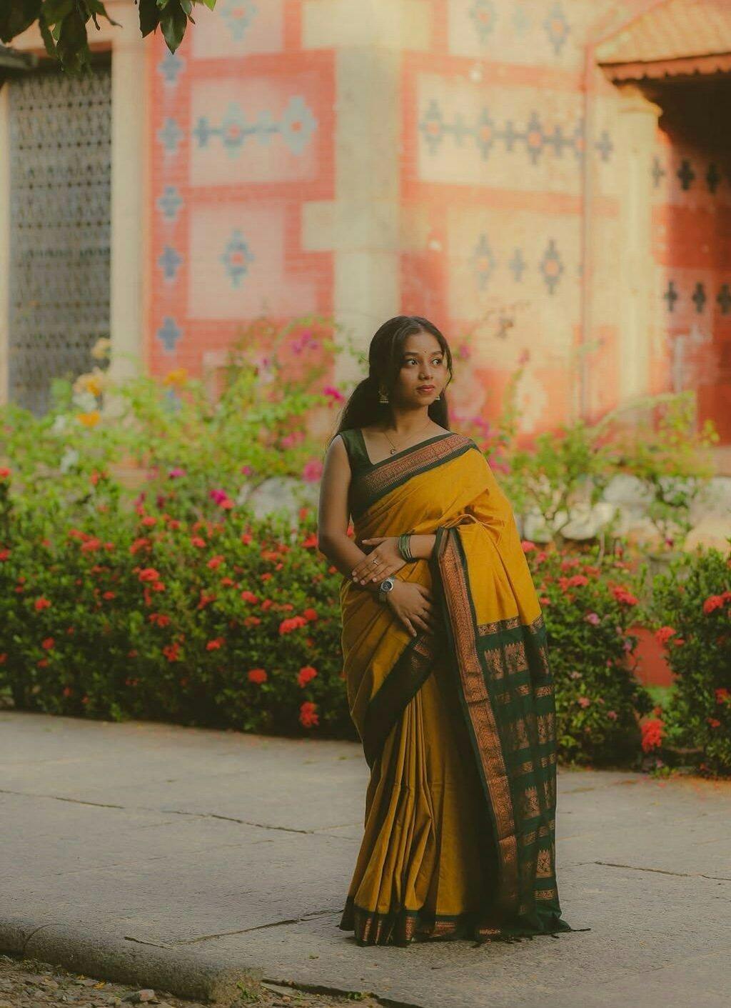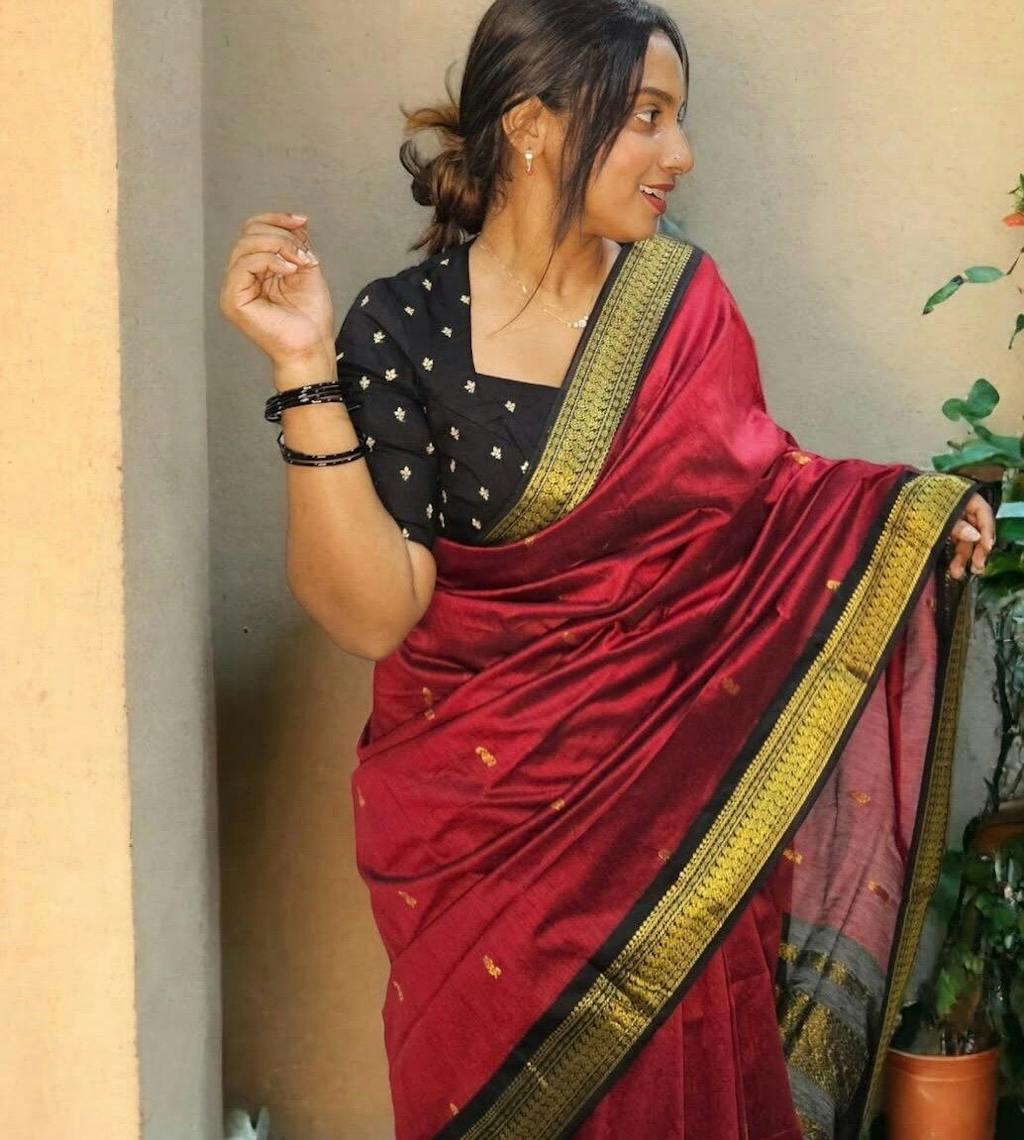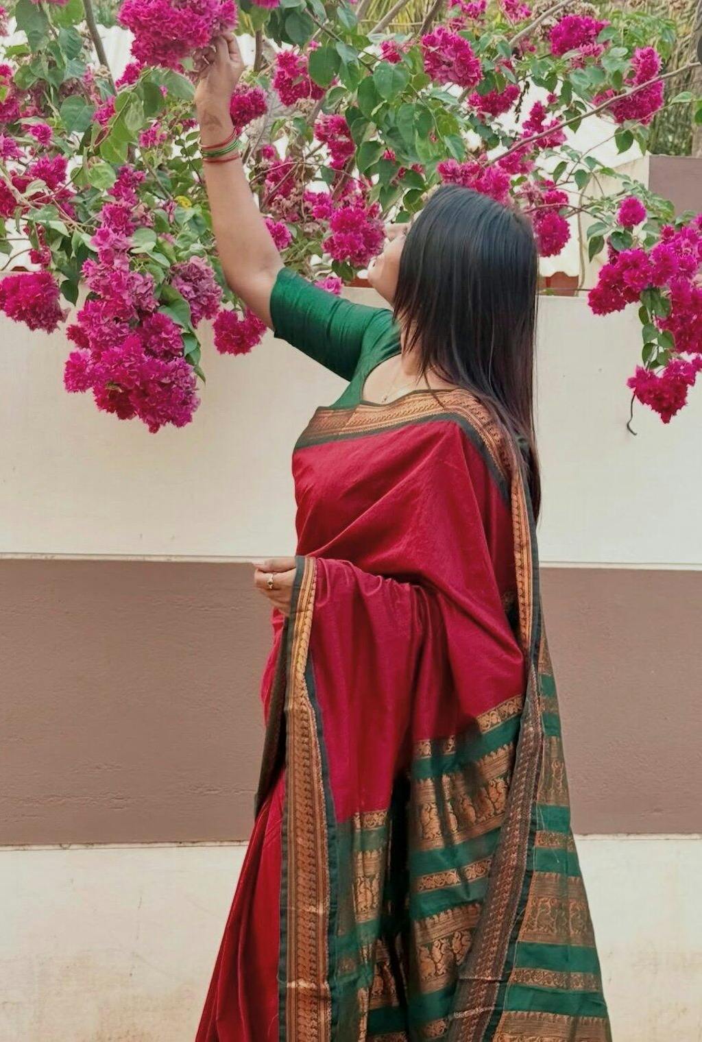 Bought a maroon/green one for a temple visit. It felt very traditional and auspicious. Everyone asked me where I got it from. It looks like a pure Gadwal silk saree but at half the weight and price. Love it.