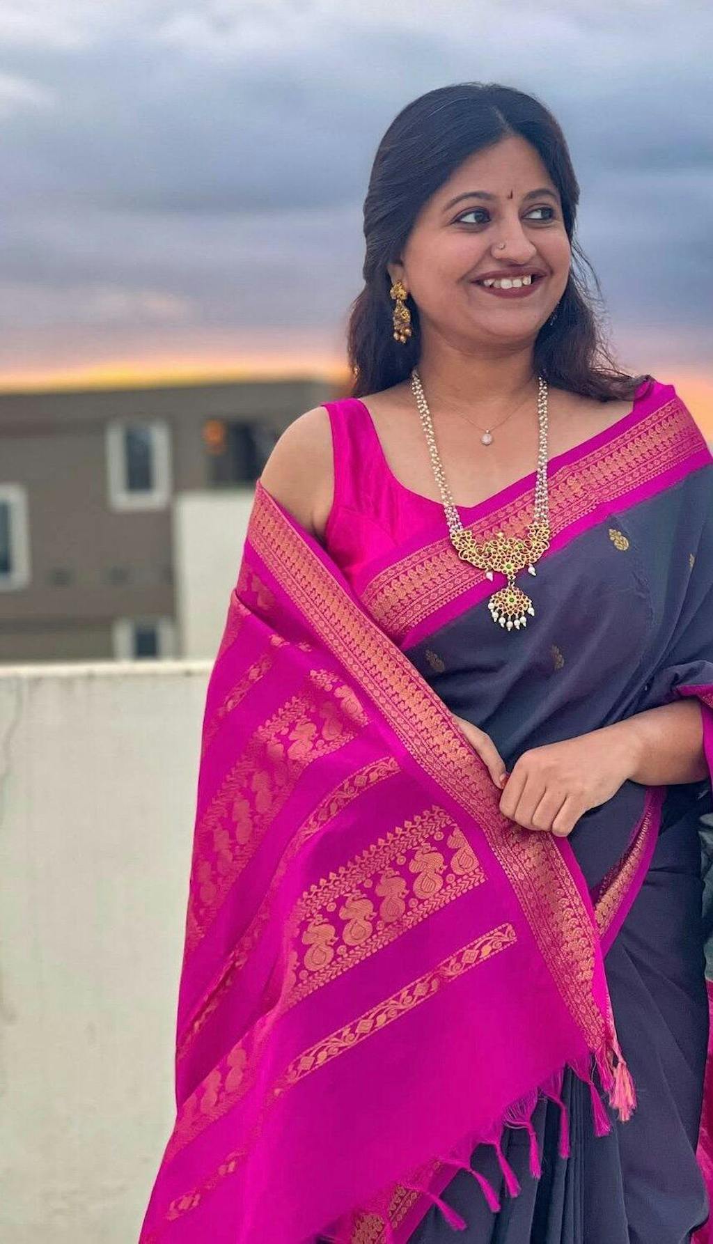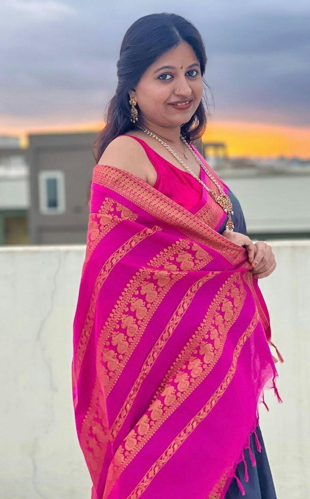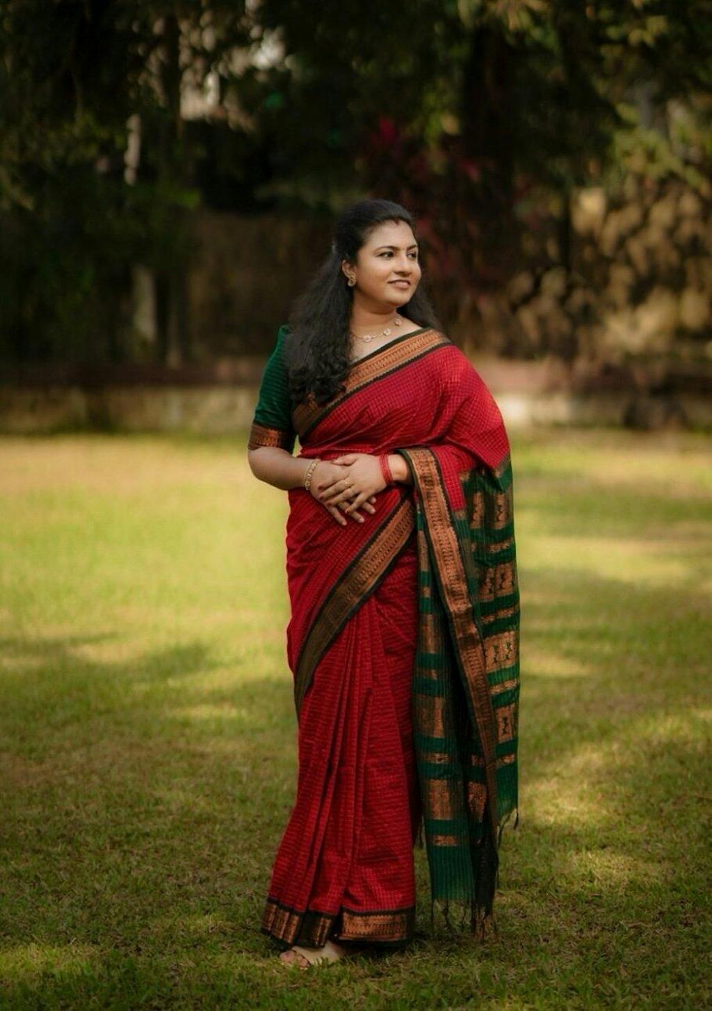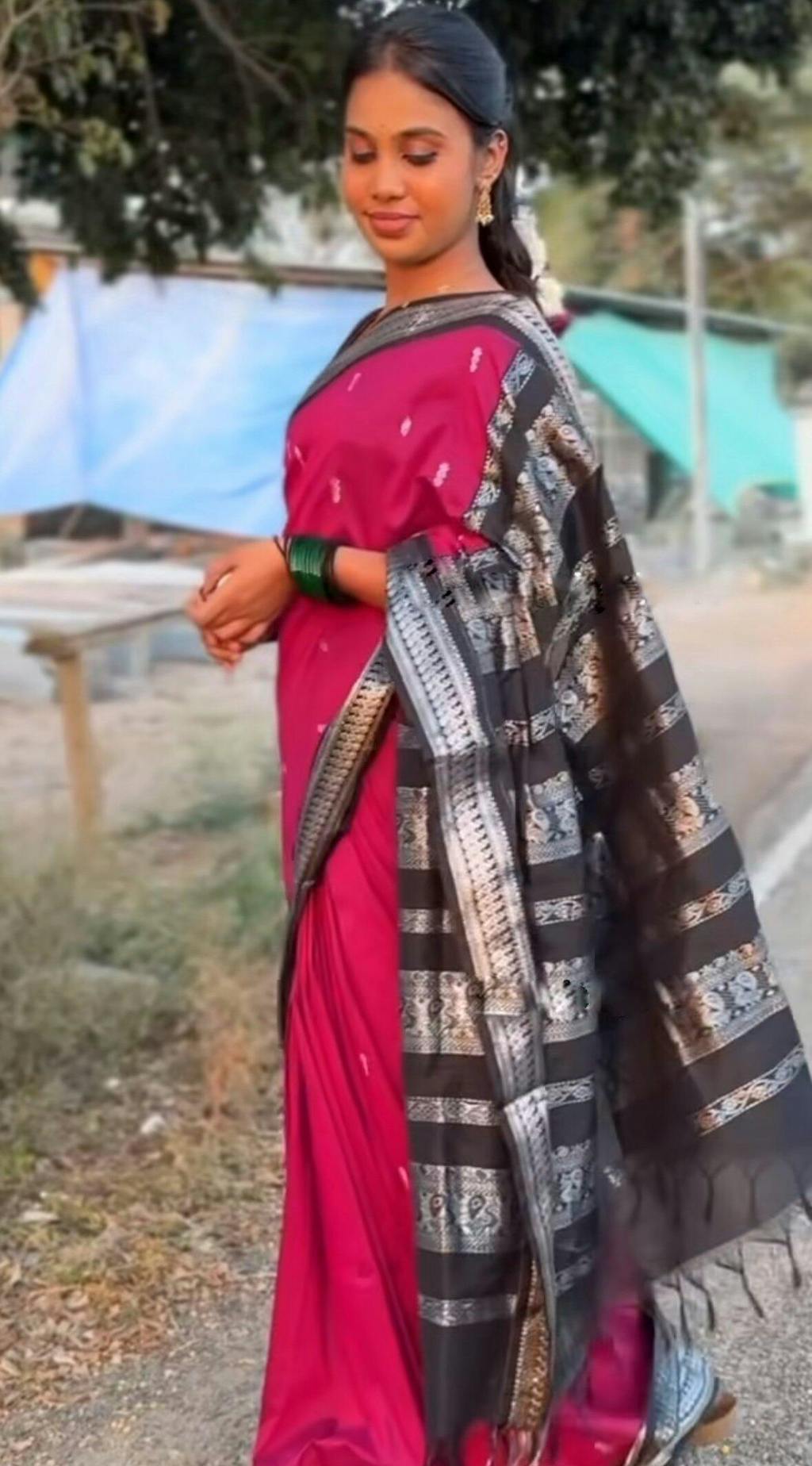 Bought a maroon/green one for a temple visit. It felt very traditional and auspicious. Everyone asked me where I got it from. It looks like a pure Gadwal silk saree but at half the weight and price. Love it.