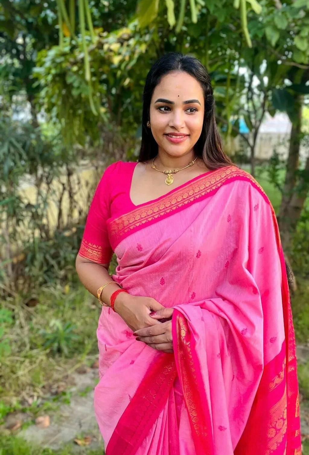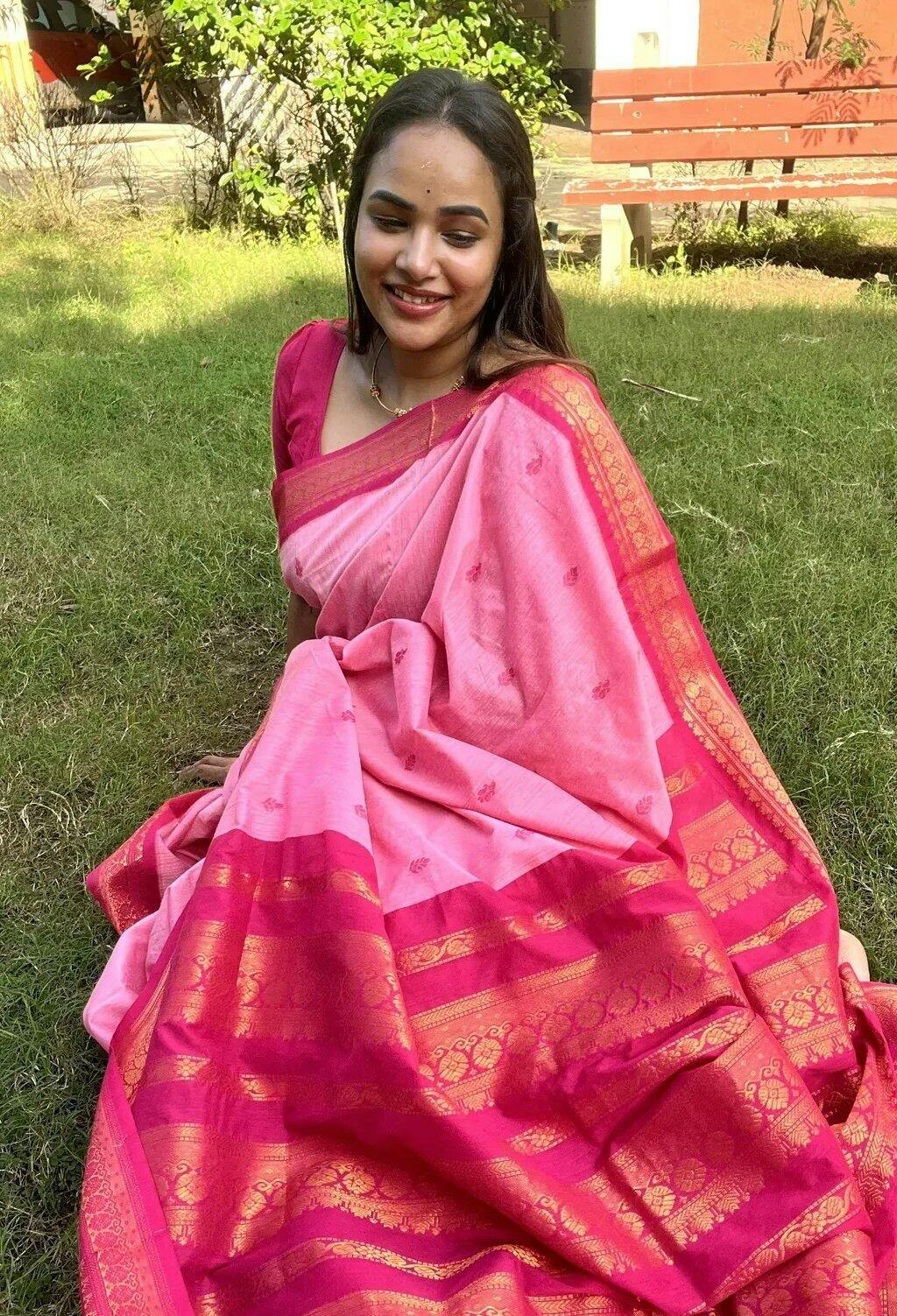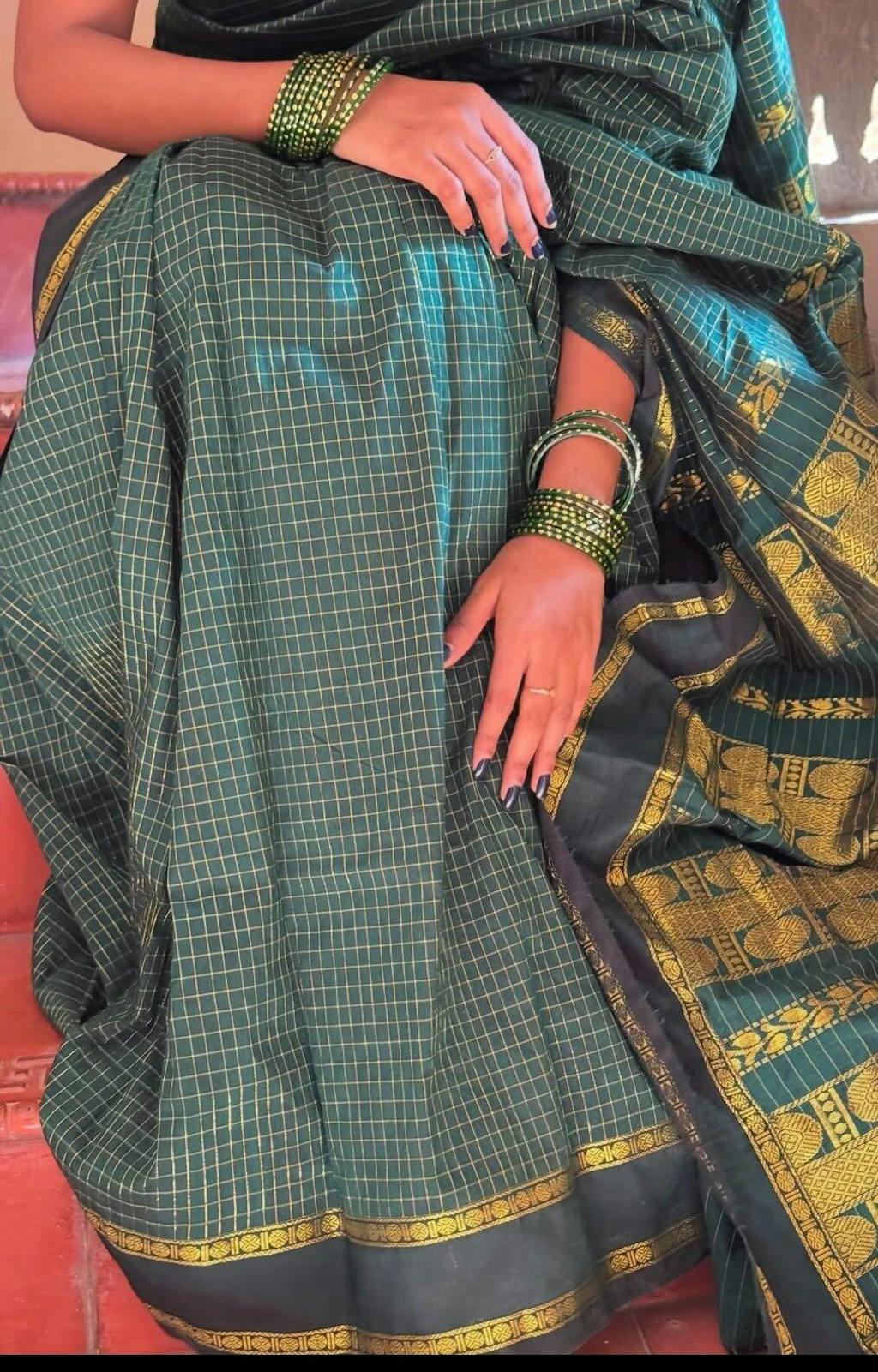 Beautiful saree at a reasonable price. I have bought Gadwal silk cottons from other shops before, but the thread count and weaving quality here at Deepa's Boutique is much better. The contrasting blouse piece is also very generous.