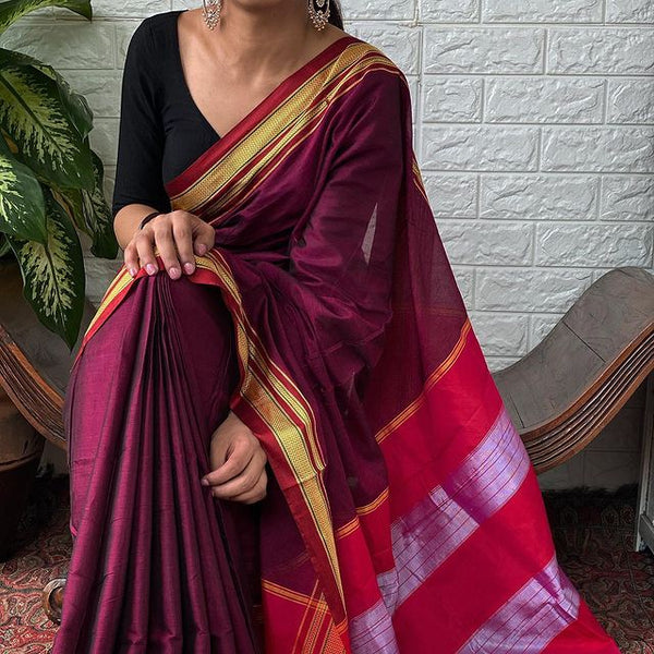 This beautiful Ilkal saree, 'Eshal -ಎಶಾಲ್' is designed with a topi teni silk pallu featuring bold red and white stripes. The maroon base provides the perfect backdrop for this classic Indian attire.