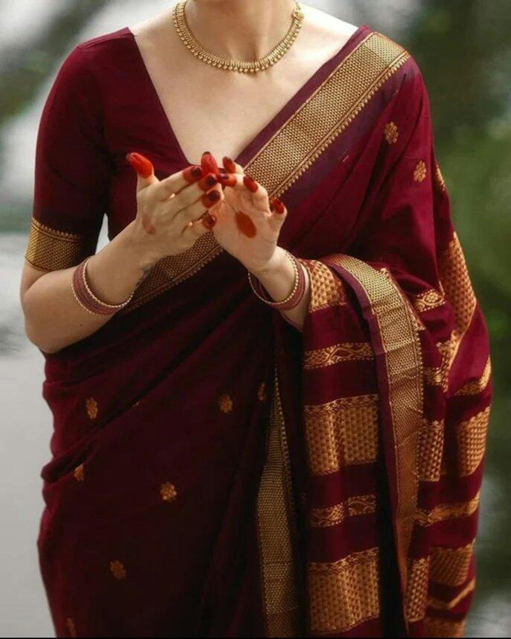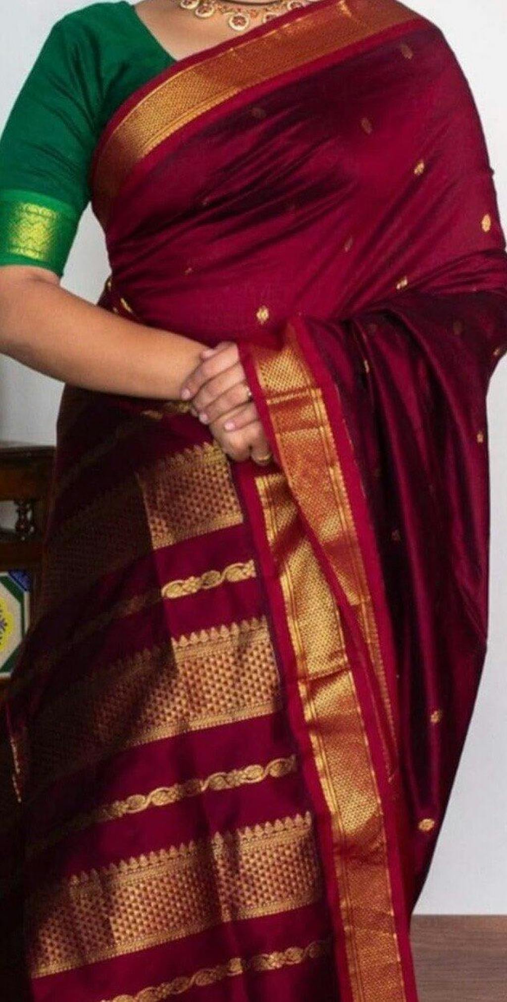 This beautiful Eshani - एशानी saree features a traditional, maroon body and border with golden zari work, and a pallu with intricate golden zari designs. Light and comfortable to wear, this saree is perfect for special occasions and easy to drape.