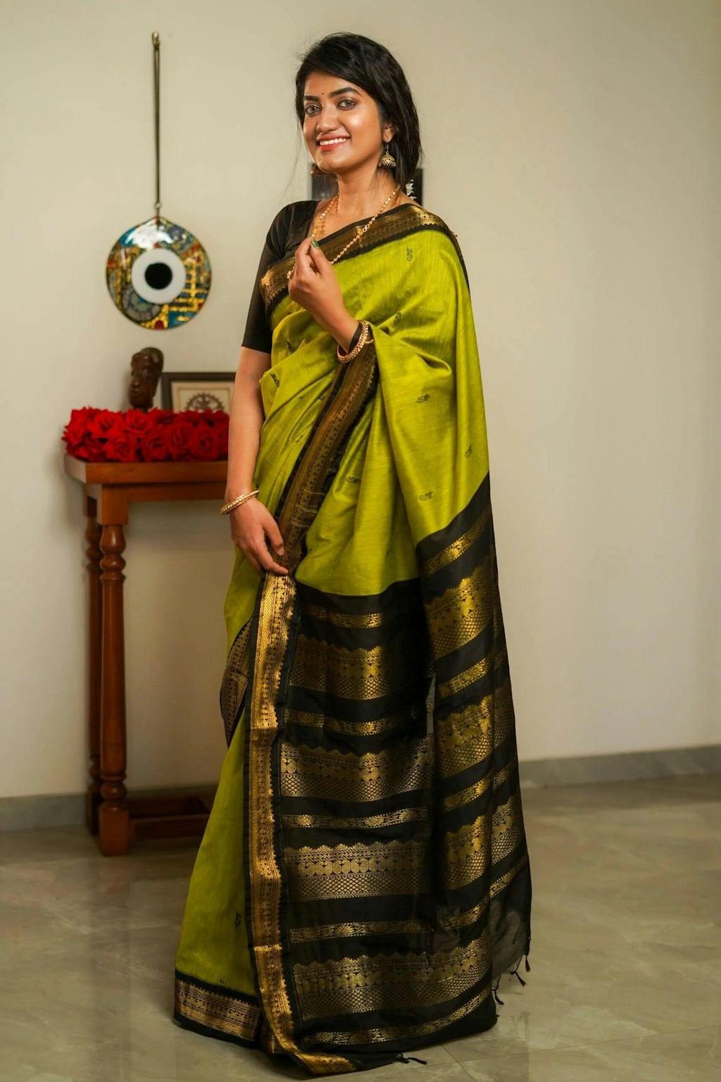 NEETHIKA - नीतिका is a lime green handloom cotton silk saree with a golden/copper zari weaving border and pallu. Its lightweight fabric ensures ease of draping. The zari weaving in the border and pallu create a classic, sophisticated look.