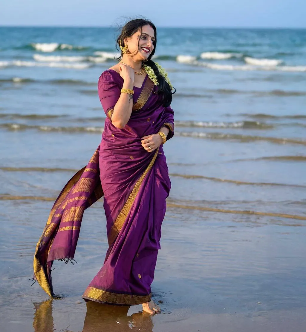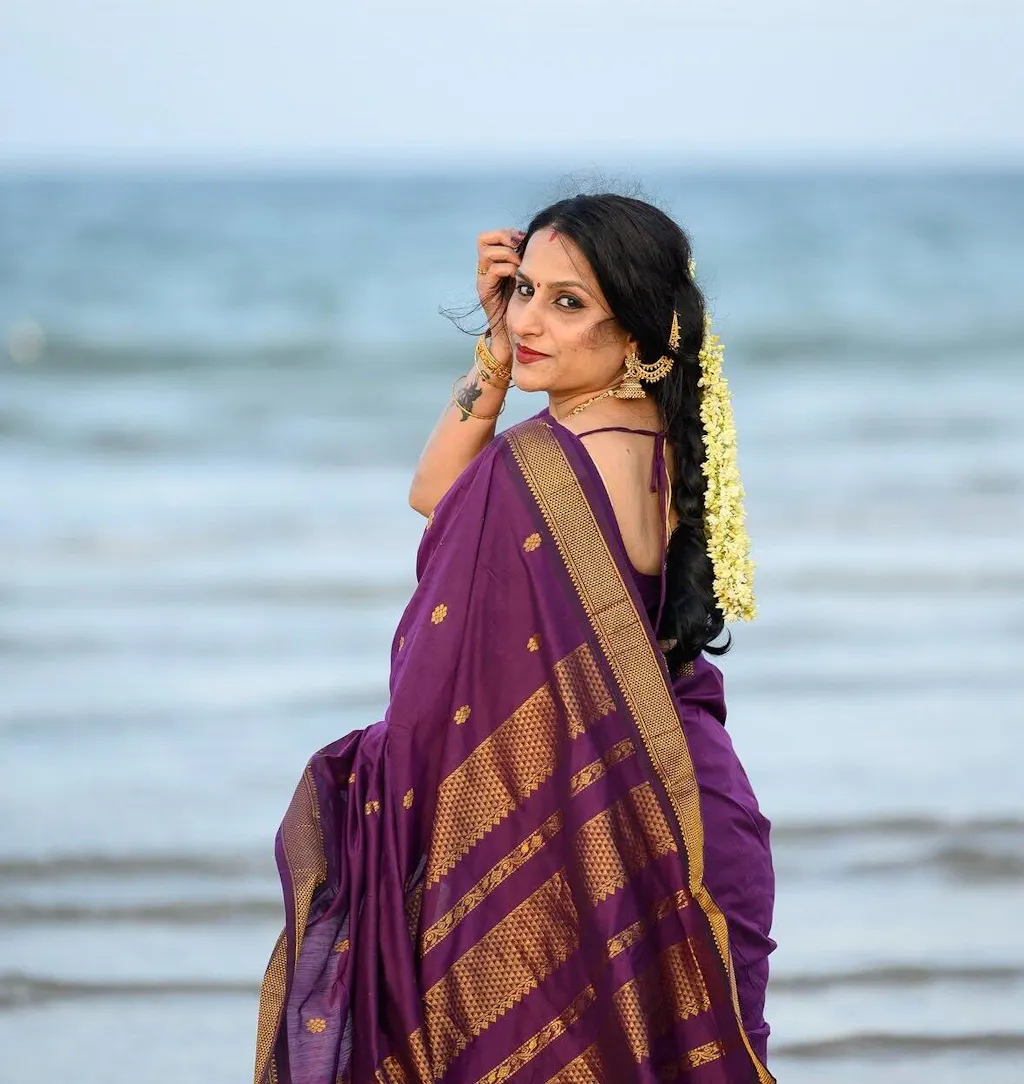 Yashika - యాషిక is a dark purple cotton silk saree with a dark golden/copper zari weaving border and pallu. Its lightweight fabric ensures ease of draping. The zari weaving in the border and pallu create a classic, sophisticated look.